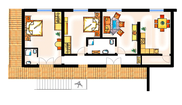 Die große Ferienwohnung, mit ca. 80 qm Wohlfühlfläche, liegt im ersten Stock mit einem separaten Eingang und bietet bis zu sechs Personen Platz. Es gibt zwei Schlafzimmer mit eigener Dusche/WC und es besteht die Möglichkeit im Wohnbereich die Couch auszuziehen.